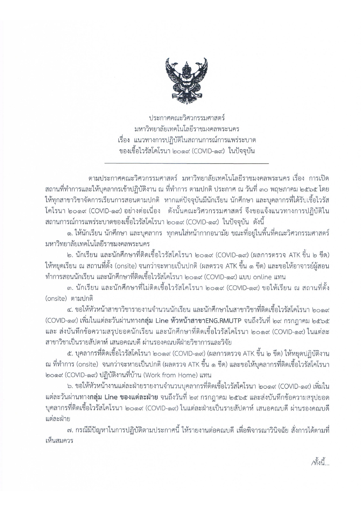 เรื่อง แนวทางการปฏิบัติในสถานการณ์การแพร่ระบาดของเชื้อไวรัสโคโรนา ๒๐๑๙ (COVID-๑๙) ในปัจจุบัน